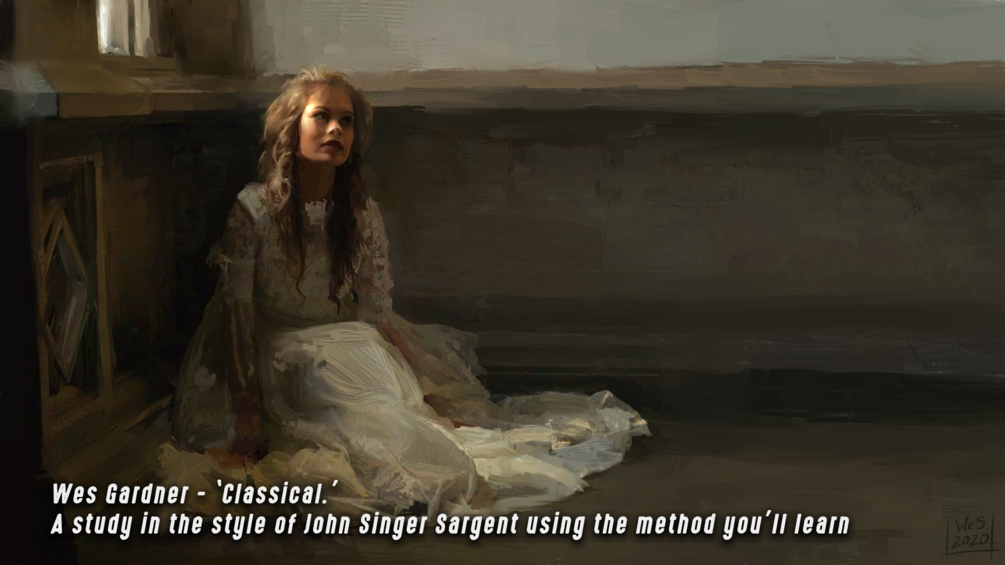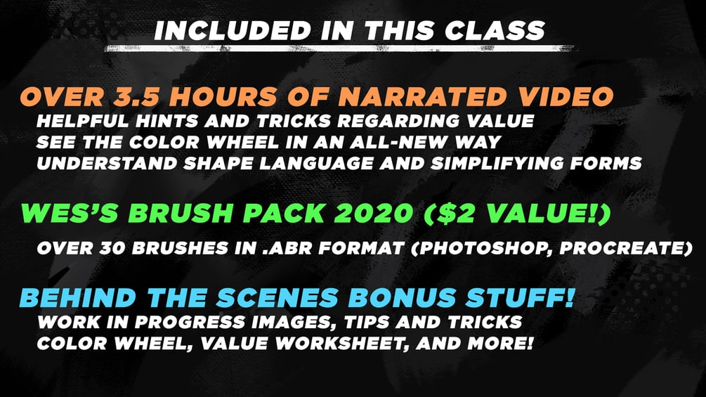 Over 3.5 hours of video tutorial (across 5 lessons), worksheets, tips and tricks images, Wes's 'Making Of' process images, references, mood boards, and Wes's COMPLETE '2020 Brush Pack' (an instant $2 value!)