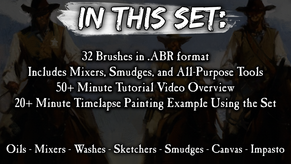 32 brushes in .abr format, a 50+ minute tutorial overview on how to best use and edit the brushes, and a 20+ minute timelapse painting video!